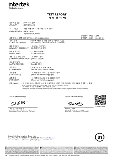 (주)콜커의 컬러 코르크 칩은 국제공인 시험인증원인 FITI의 종합 환경 분석 결과 카드늄, 납, 수은, 크롬 등의 중금속 함량이 허용기준 이하로 알루미늄, 코발트, 비소 등의 용출성 중금속, 프탈레이트 함량, PAHs 함량 또한 허용기준 이하의 테스트 결과가 나온 우수한 친환경소재입니다.