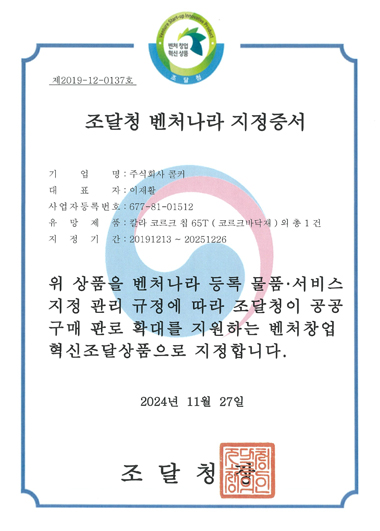 (주)콜커의 컬러 코르크 칩은 조달청이 공공 구매 판로 확대를 지원하는 벤처창업혁신 조달상품으로 지정 되었습니다.